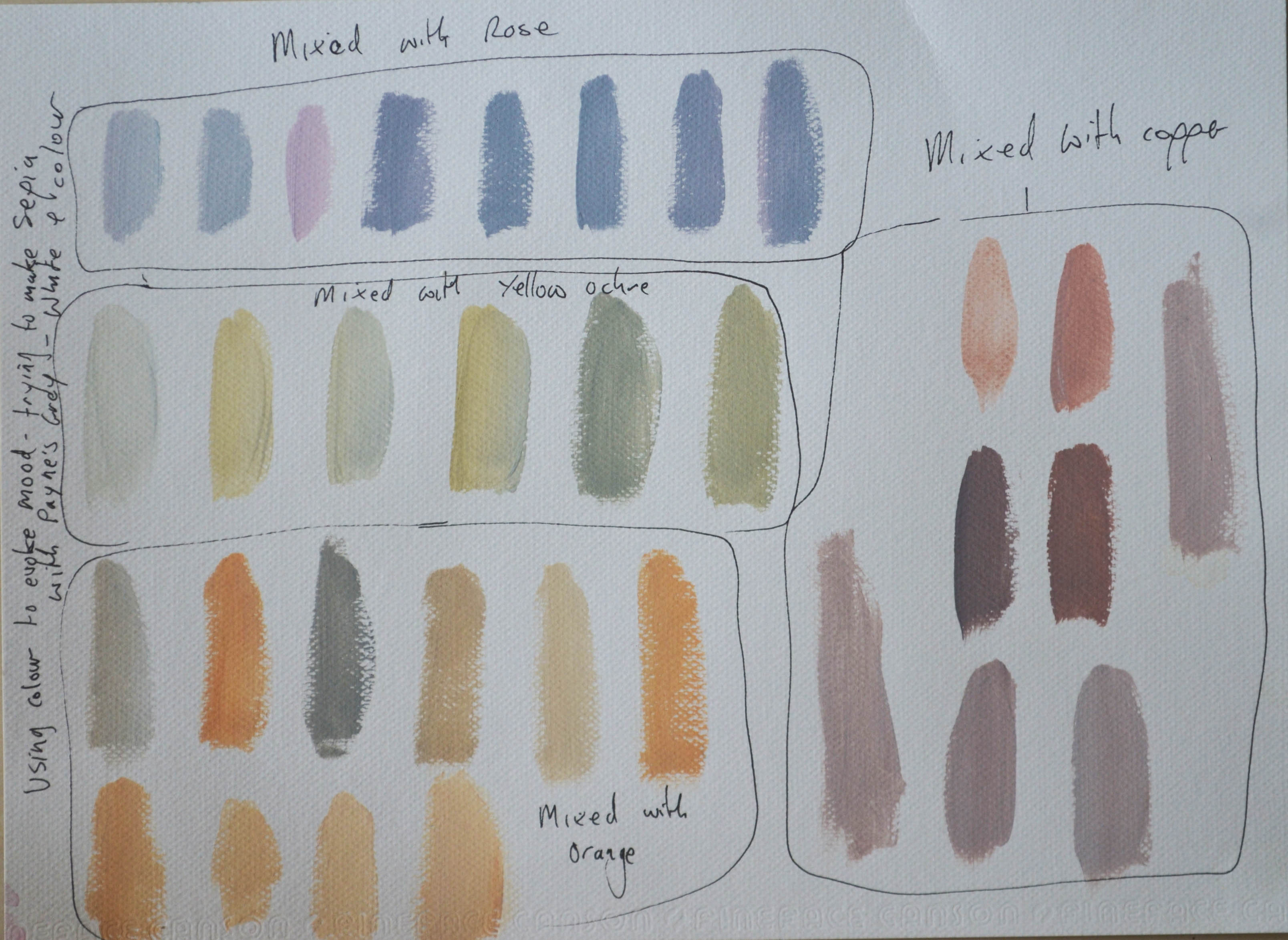 It wasn’t as easy as I thought, I could see a lot of different hues in the Sepia photo and so I decided to experiment with some colours, these were: