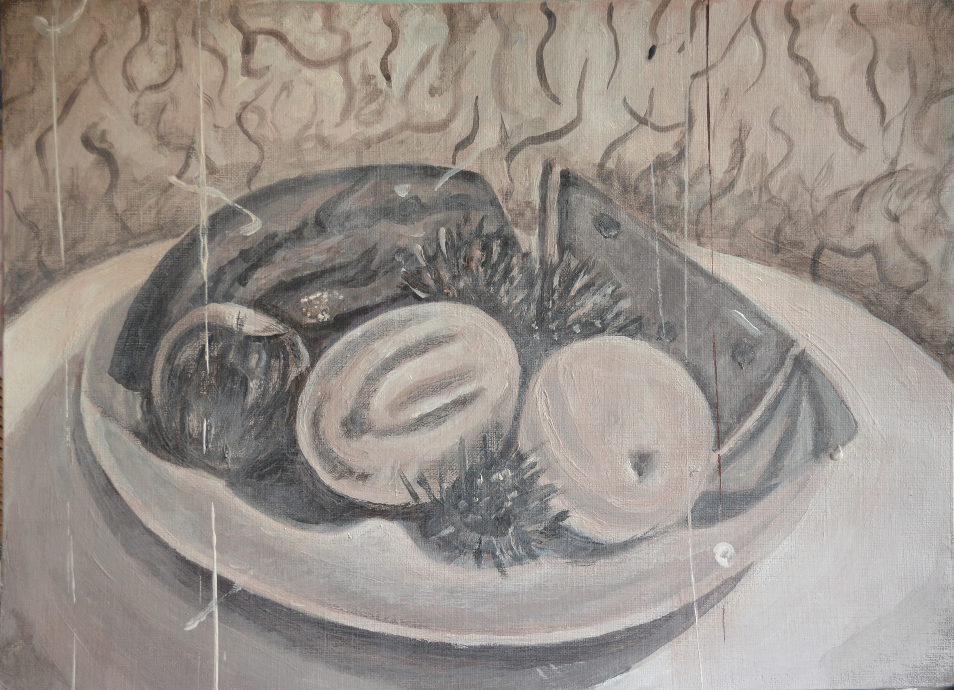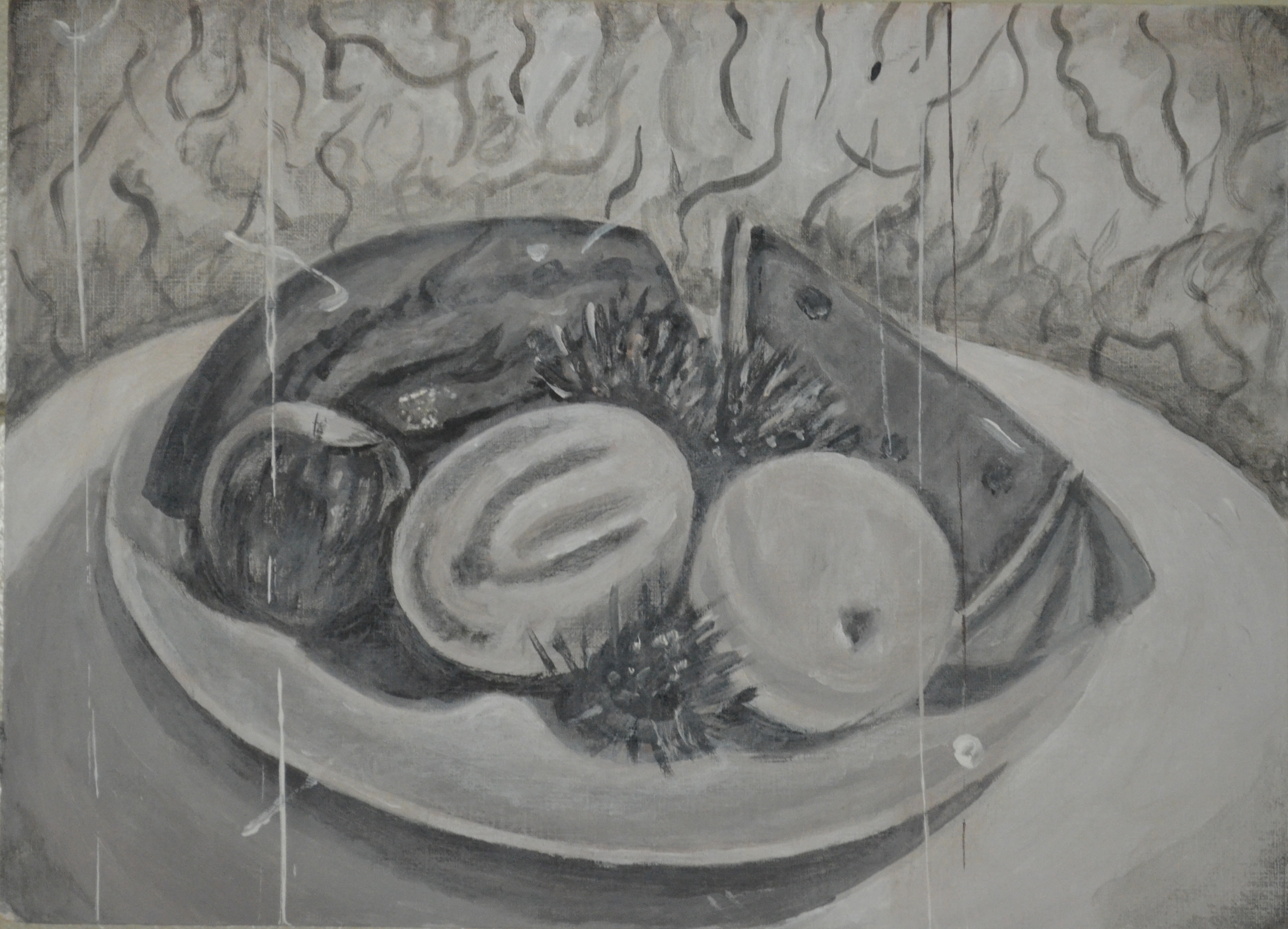 Of all the colours the copper mix looked best and so I decided to start the still life composition to see how well the colours looked together. I used the same big brush technique as in the previous exercise barring the spines of the rambutan. Eve though the three colours looked great together in my experiment they didn’t look that great on paper the Payne’s gray looked too blueish and it was obvious it needed swapping for black. I was also going through the copper at an alarming rate as it was only a small tube then I realised that the copper was very similar to Burnt Umber and so I swapped again.