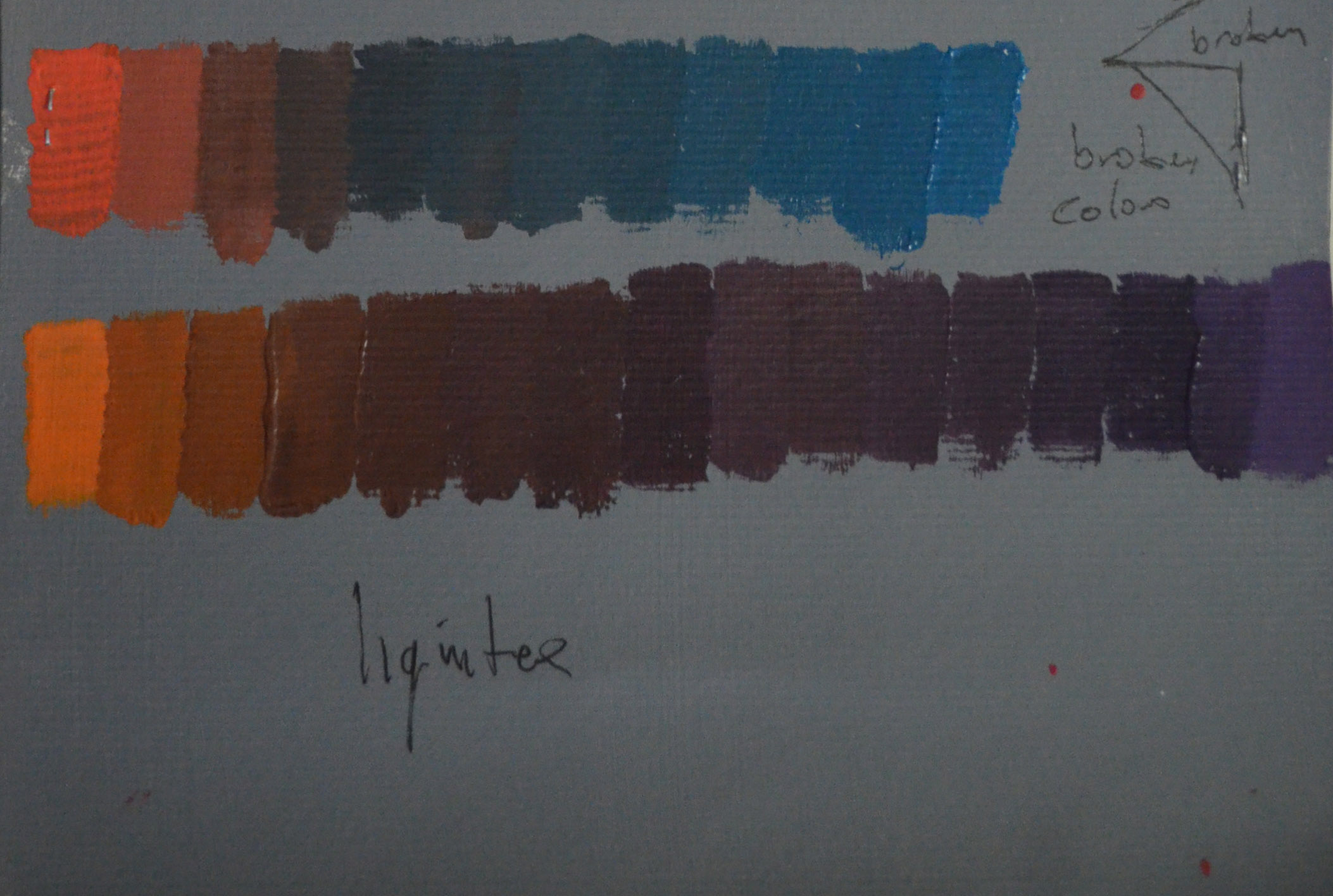 Make a scale between an orange red and a greeny blue. Try to maintain constant tonal values across the scale by adding a little white, as you did in the previous exercise. At the mid point at more white the result should be grey. This is known as a broken or tertiary colour and this type of colour makes up the appearance of much of our world.