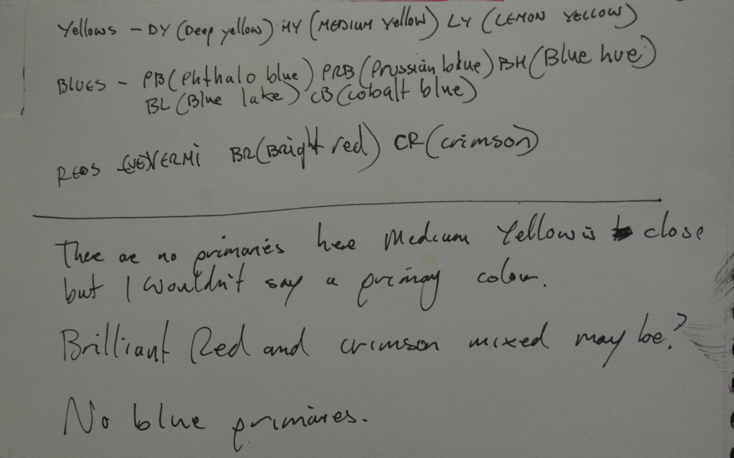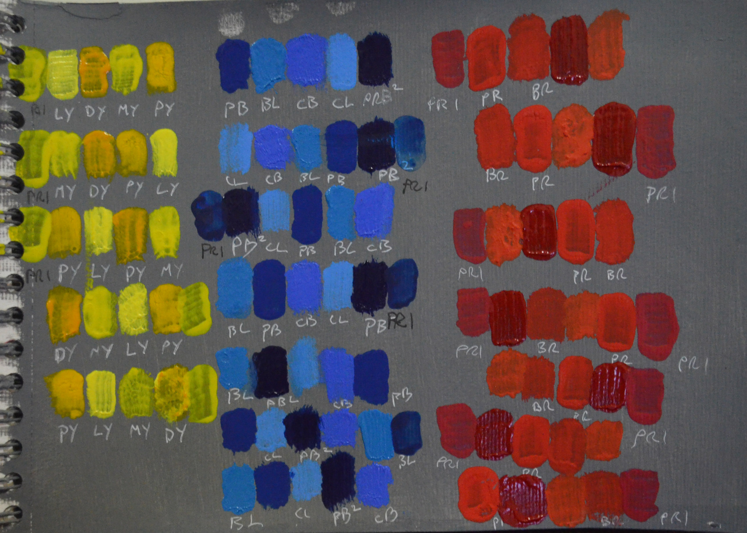 I started by laying down all the yellows that I had which wasn’t a lot, lemon yellow, deep yellow and medium yellow. For blues I had Phthalo blue, Prussian blue, cobalt blue, blue hue and blue lake and reds Vermilion, bright red and crimson, there were no primaries in any of the colours, each of them showed sign of other hues and to be honest I really didn’t know what a primary red, blue or even yellow looked like so to be safe I thought it was time to buy primary colours just so I knew.