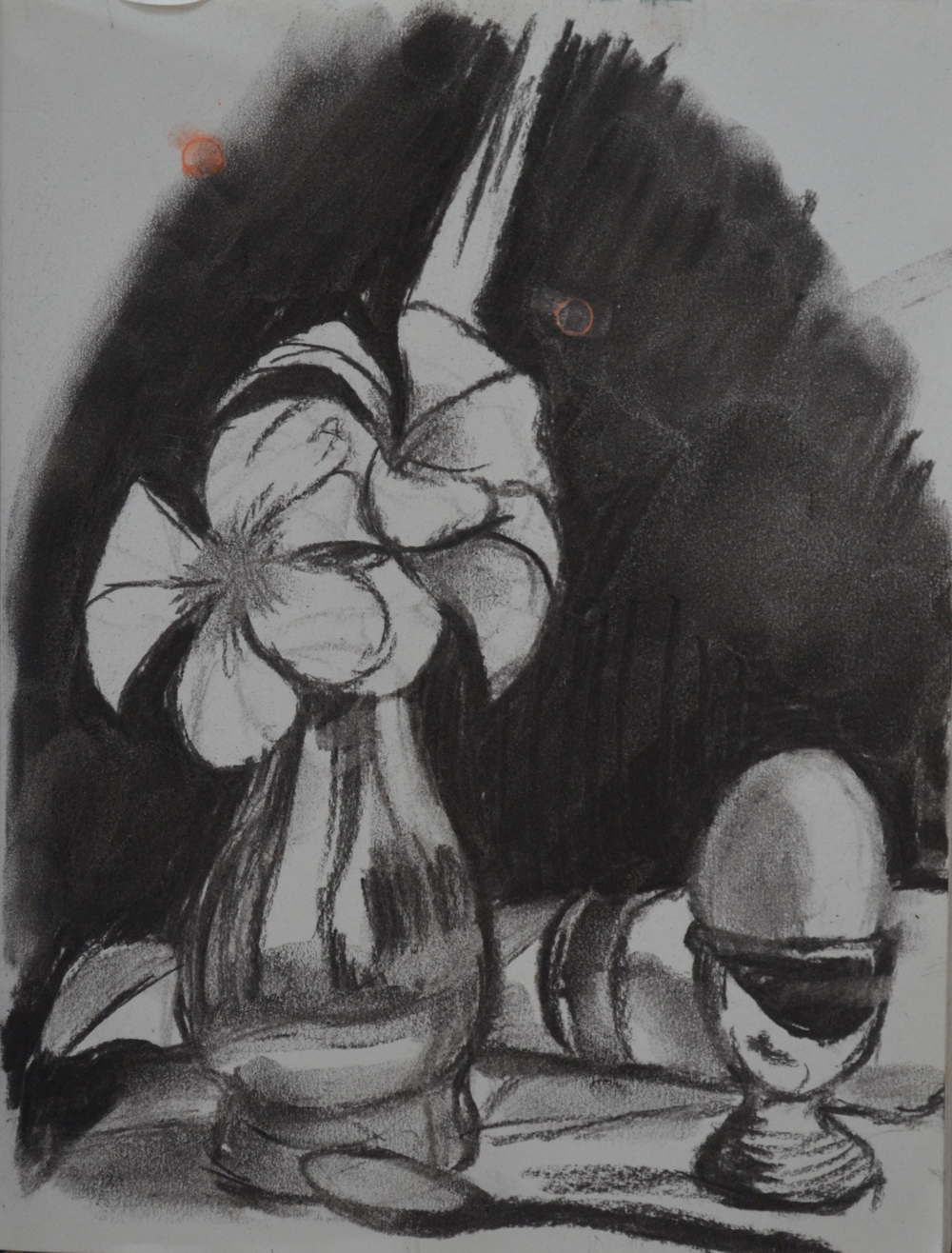 Working in my small 1 bedroom flat I am limited to where I set up a composition and what I set it up on as I don’t have many shelves or units. I chose to set the objects down on a black chair which gave me a black background. I played with the subjects trying them in different positions and looking at them from different angles but there seemed to be only 1 composition and one angle from which this still life would work from and for me the first charcoal sketch confirmed this for me.