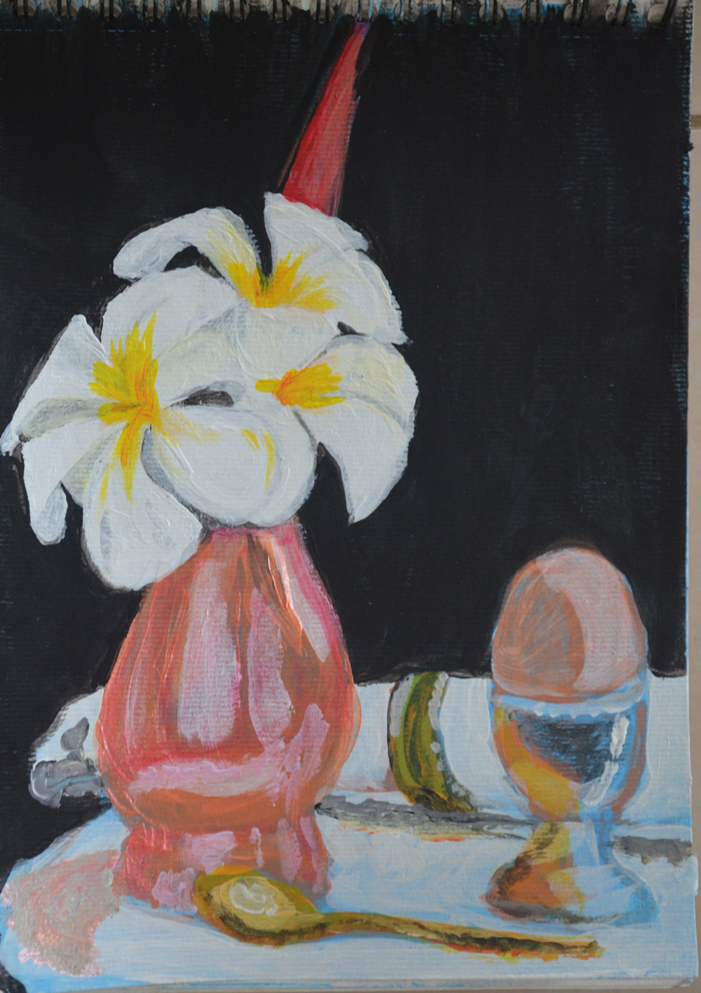 I had painted my assignment piece in landscape so for this one I really wanted to paint in portrait, adding the Heliconia behind the Frangipani meant that I could paint the eggcup and the vase on a large scale in portrait format while making the best use of the paper in this format.