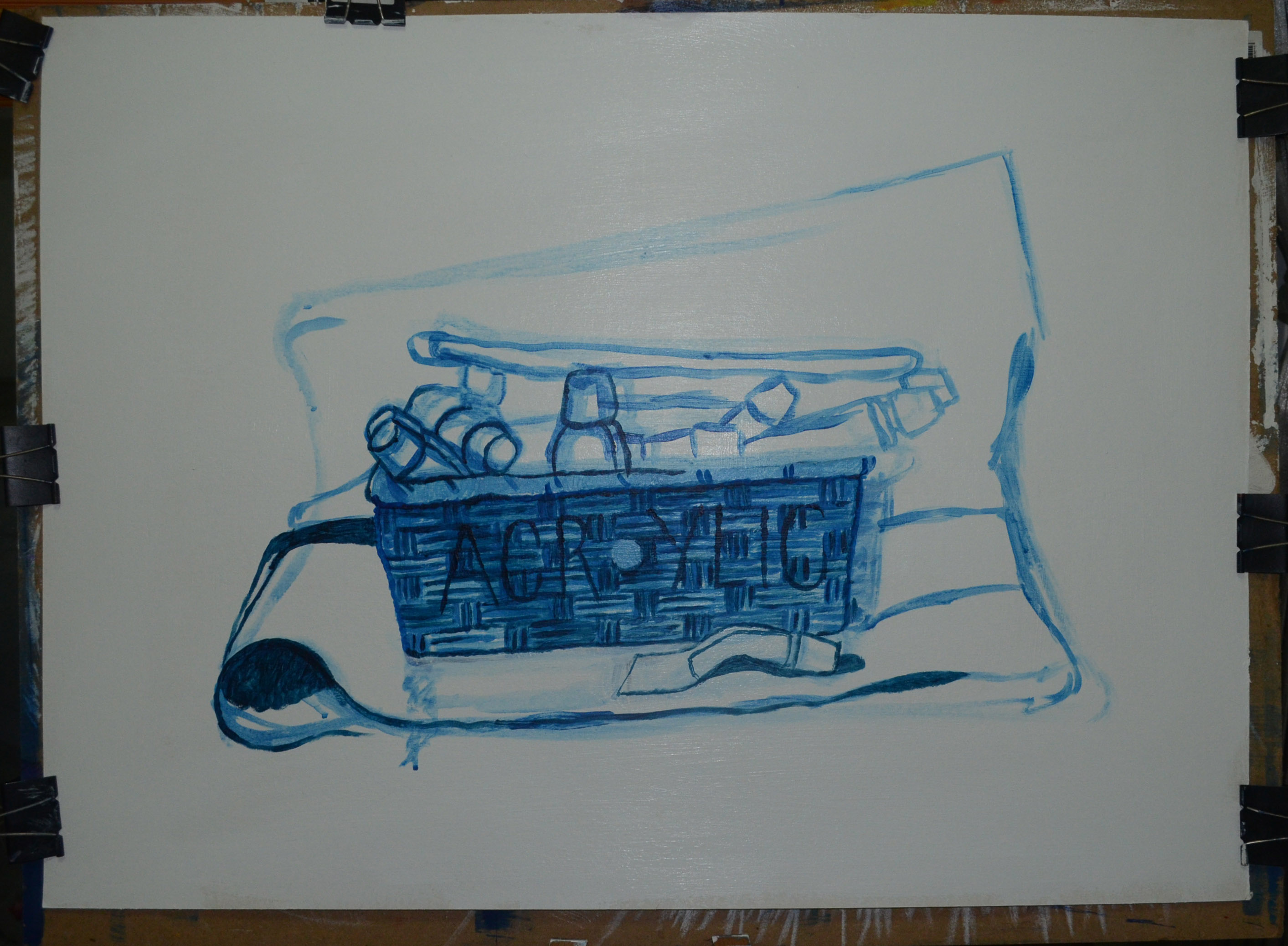 When it came to painting in acrylic there was no mineral blue but primary blue mixed with a certain amount of white had the same hue, so that wasn’t a problem. I began the painting by drawing the main shapes with a dilute mix of primary blue. There were plenty of errors and I would soon find that the position of the tubes of paint  (and they were positioned, not just thrown in) made them unconvincing as tubes of paint so I had to think of how I would make their forms more visible.