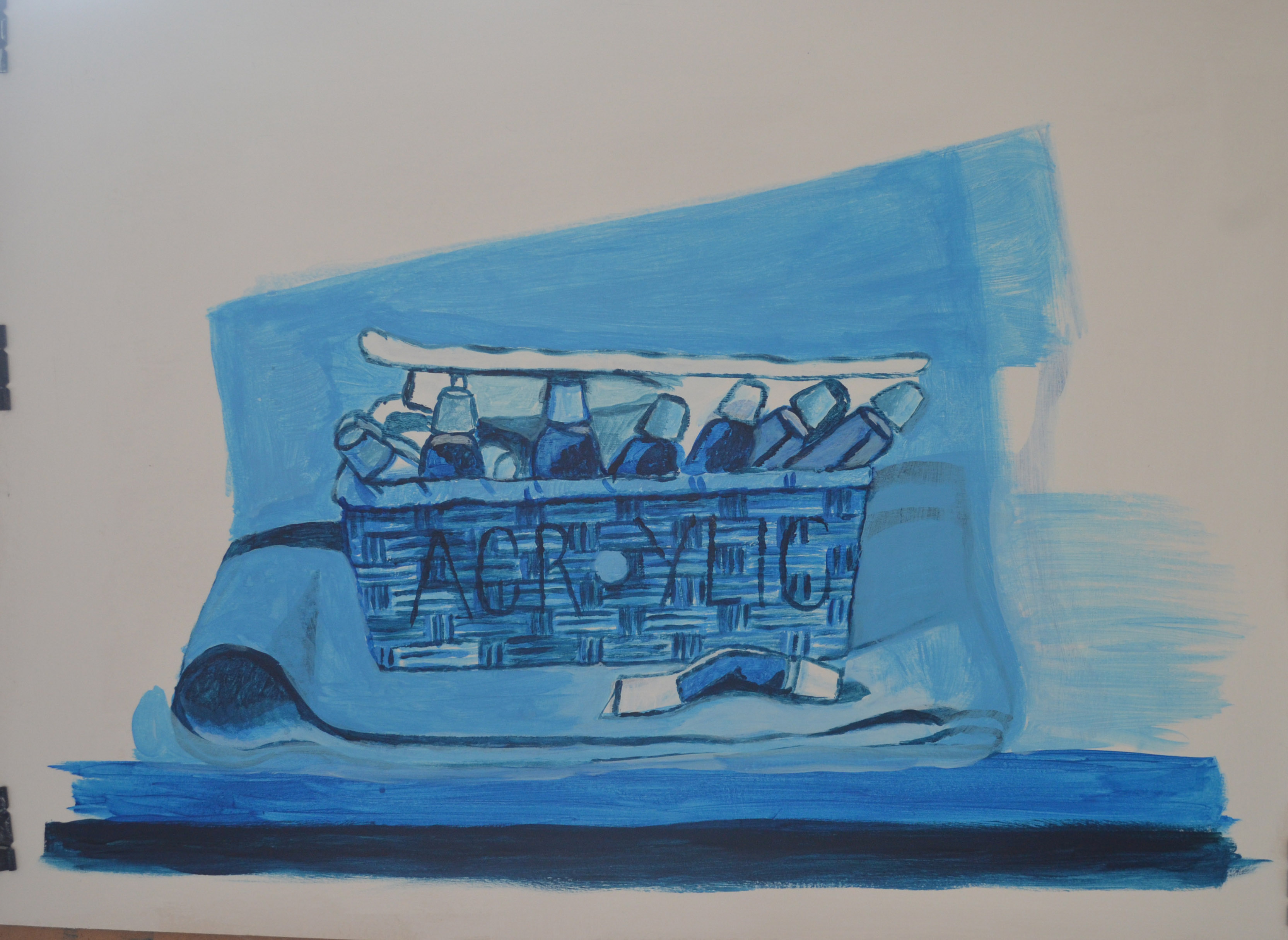 This led to my next drawing in watercolour in my mixed media sketchbook over two pages something I hadn’t yet tried out. The drawing was really rough and didn’t take me long to complete but what I did learn from it was that firstly, I would use be using mainly blue as ‘blue’ was the mood I wanted to depict in my painting. I saw the tubes of paint inside the basket as being trapped inside the basket and the tube in front as escaping but not yet free and that is what I wanted to put across.
