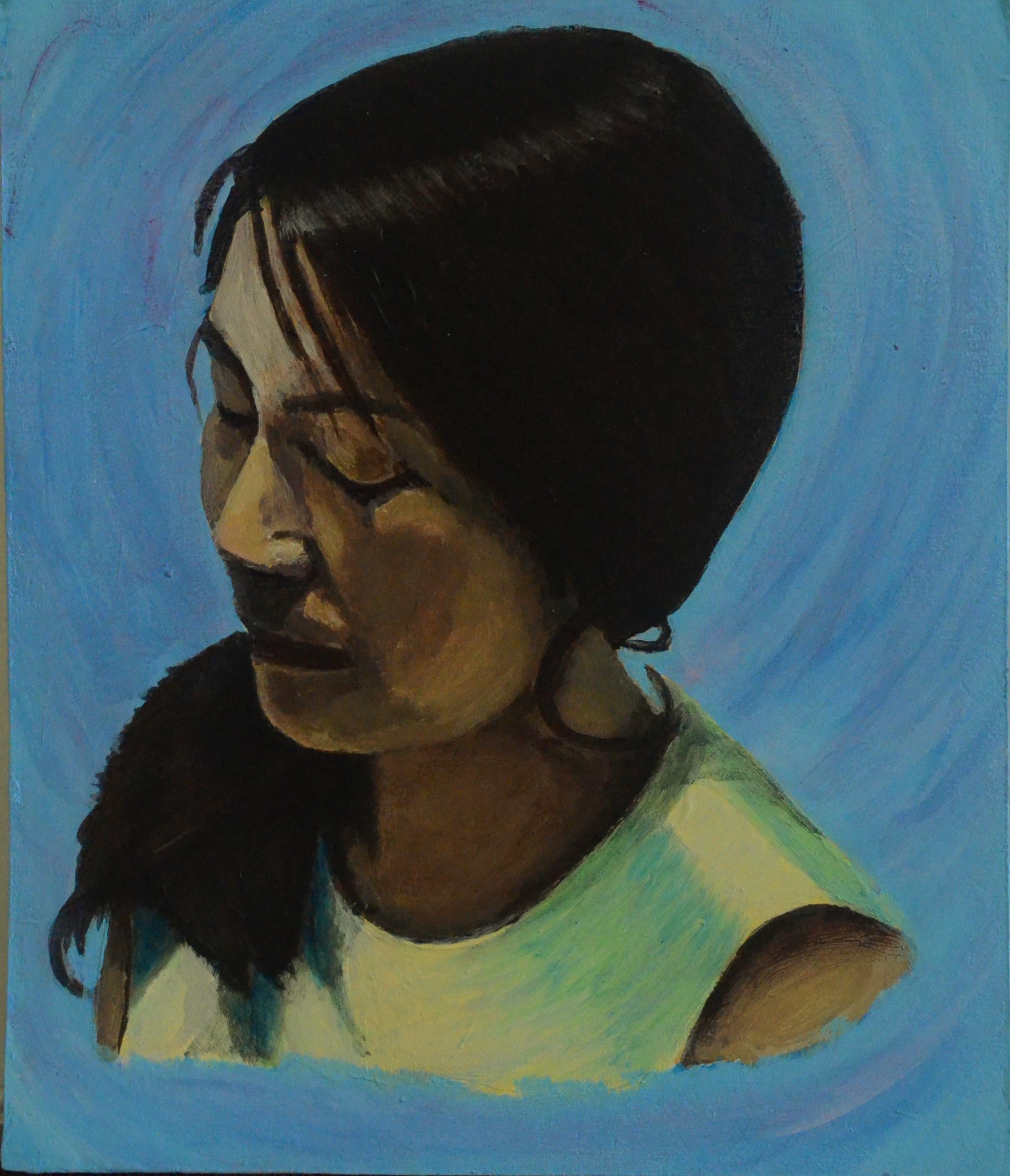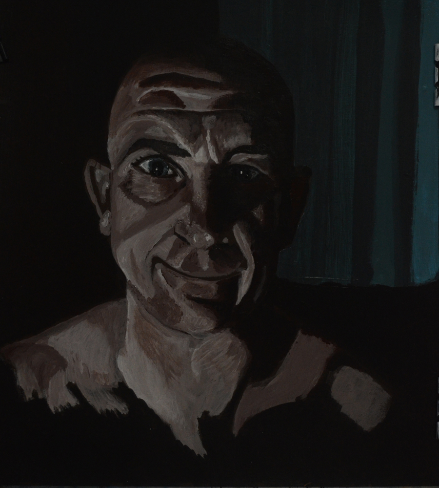 From there I continued to let myself be influenced by Picasso and started to add rose to the face and thin layers of red to the lips as well as painting in the teeth and a very small amount of the whites of the eyes. This really brought the painting to life and I felt that I had succeeded not just in creating mood and atmosphere to the painting but in recreating a similar technique used by Picasso in his blue period paintings.