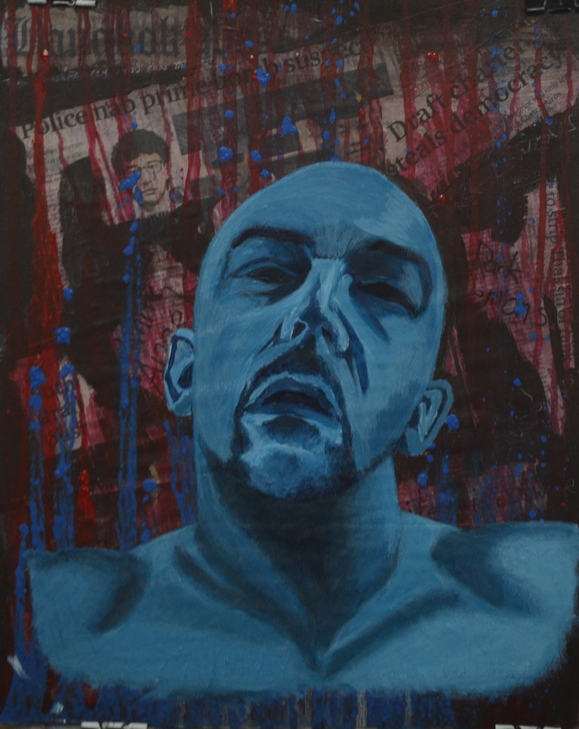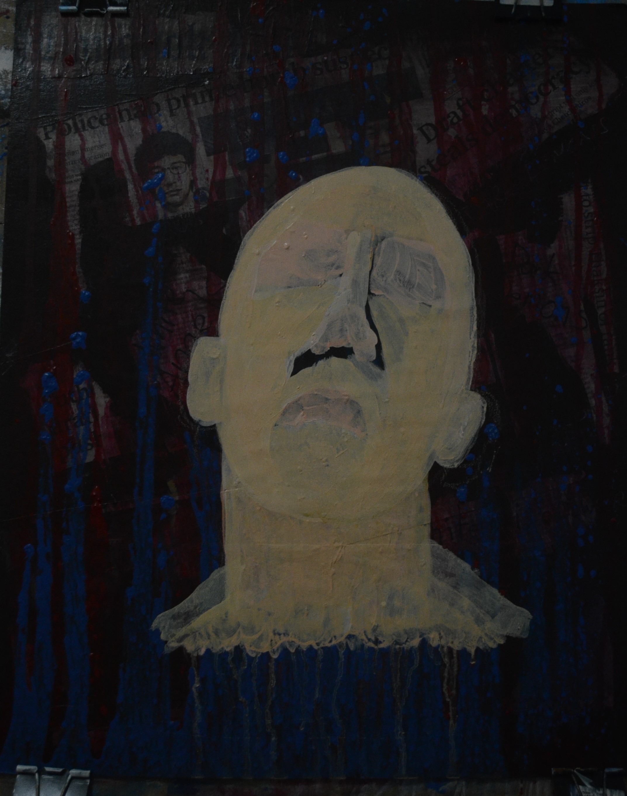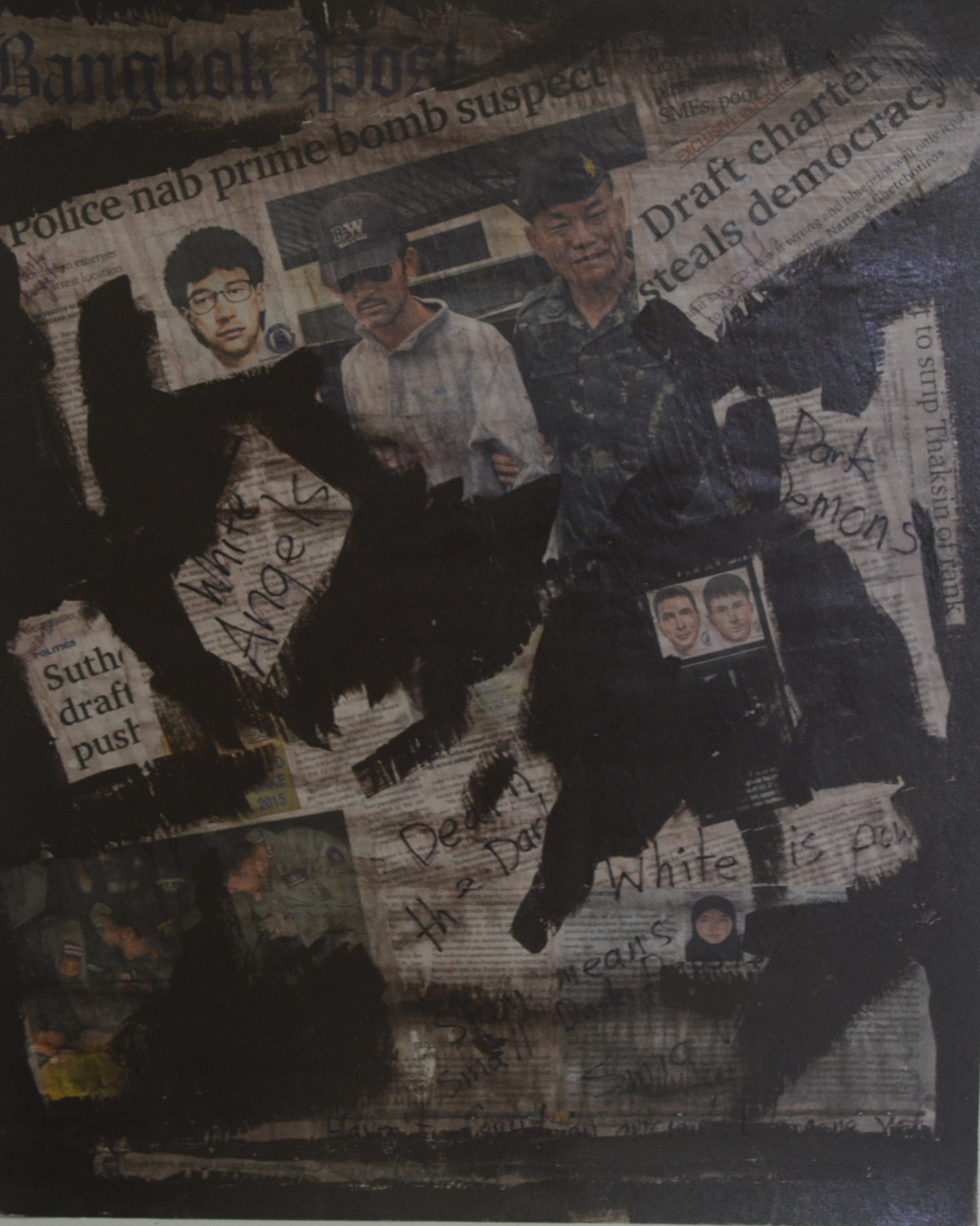 I wanted to start with an expressive background and I did look at different artists and even thought about trying to recreate a similar background to Elizabeth Magill’s paintings that I covered in my Tutor Recommendations 1 Post. In the end I settled for something that I had wanted to do for a long time and inspired by Guy Denning’s drawings over newspaper I began to put together a collage background from the Bangkok post. It has been eventful 2 years with a Military Coupe and bomb blasts signalling the end of democracy and a military clamp down here in Thailand and we have all felt it from Farang (westerners) to Thai people and if anything was going to create a trigger for my release of emotion while working on this painting, then local newspapers would be it.