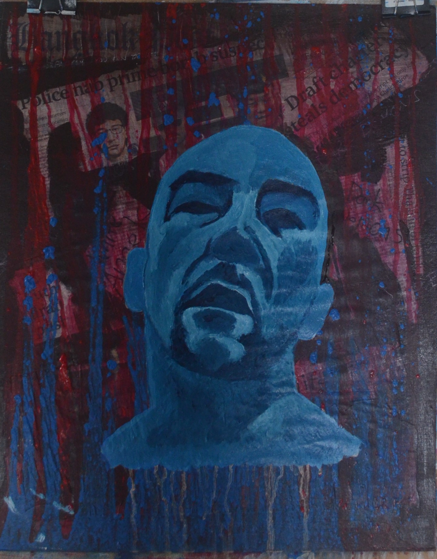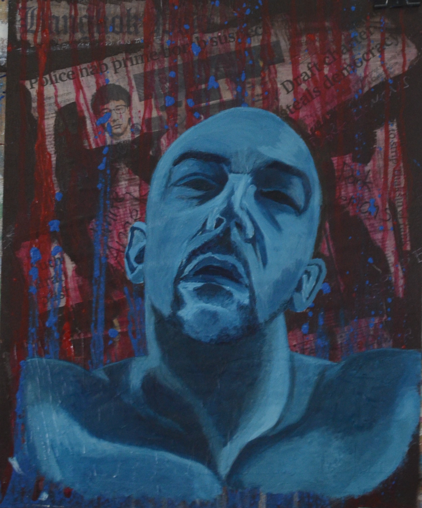 After realizing that the lighter skin tones wouldn’t work with the background and other colours I decided on blue. I began by building up the tone with Prussian blue and white but I was left with the dilemma of the lighter colour drips below the neck and so began to ponder on how to correct this.