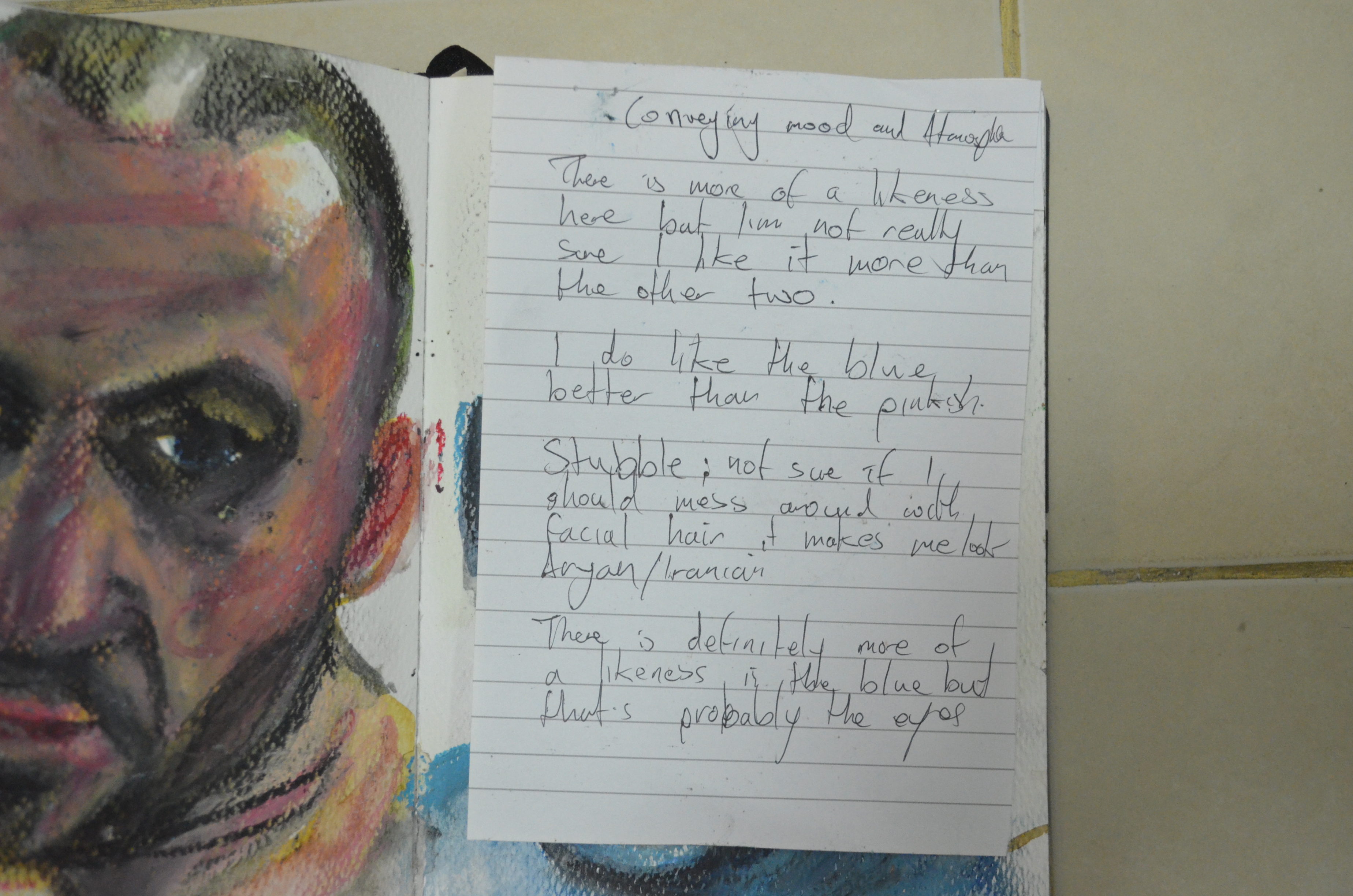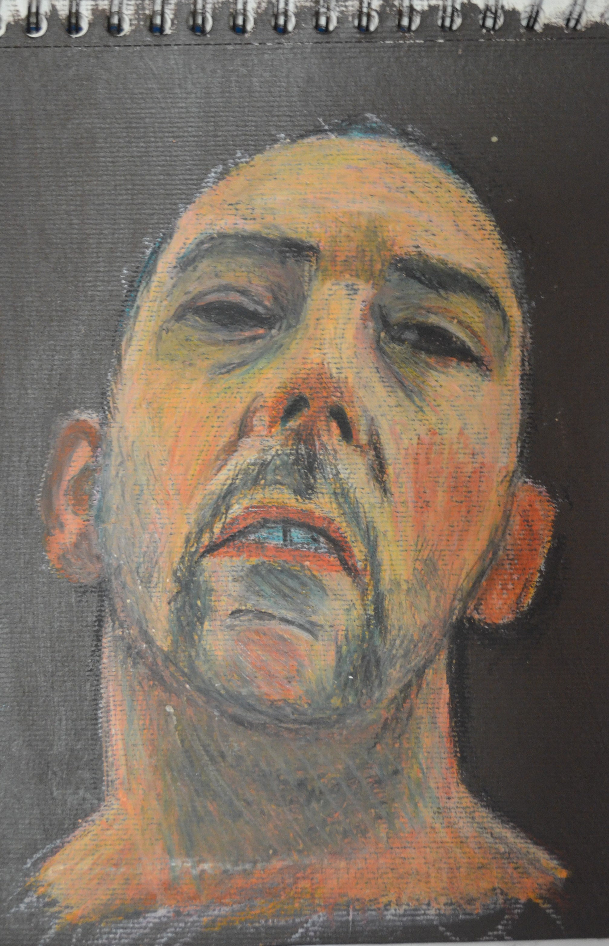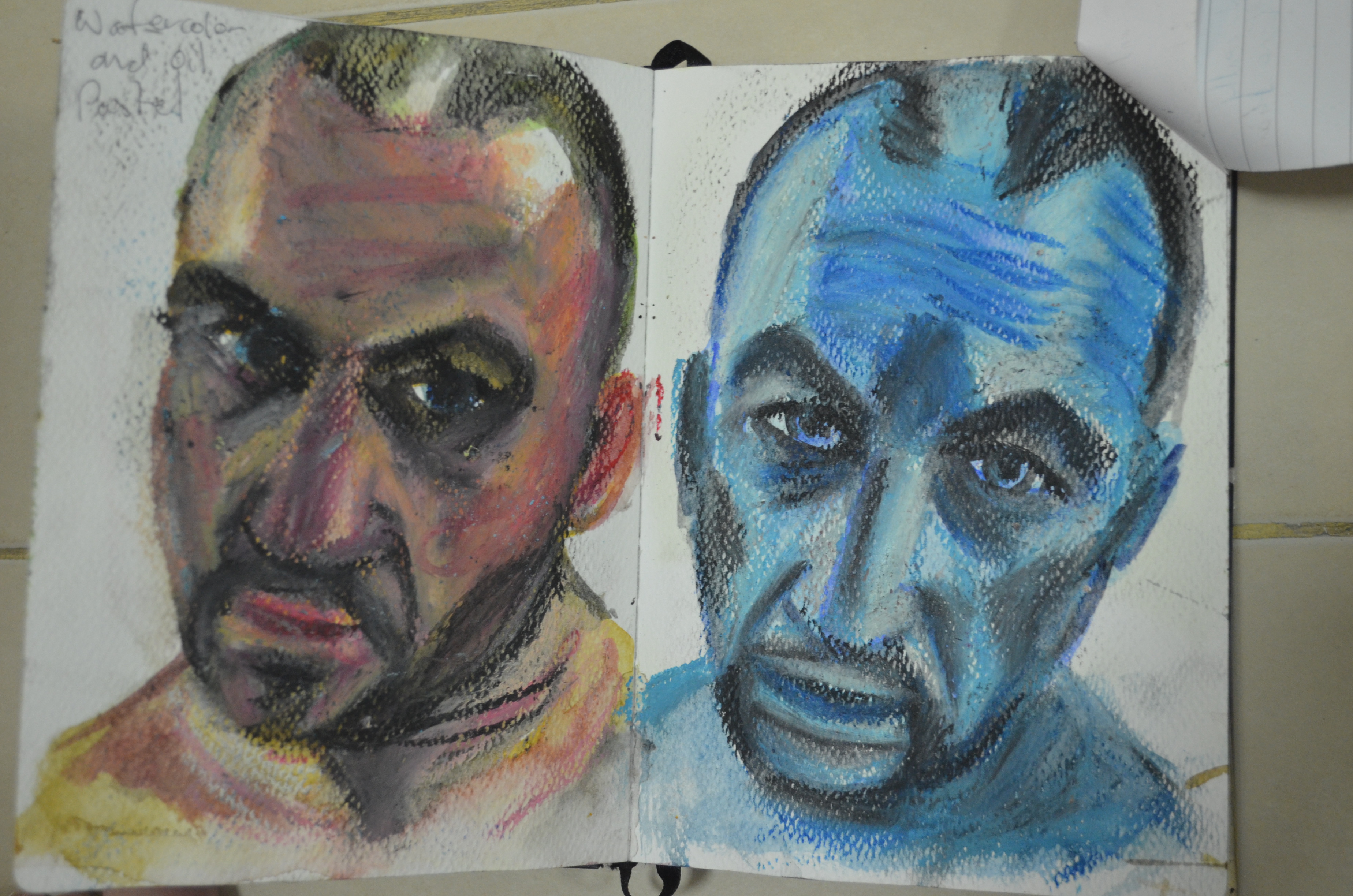 My first study was in watercolour (right) followed by another with my head in the same position which I drew in oil pastels over the watercolour paint this gave it a detailed sketchy look reminiscent of urban art portraits. By blacking out the eyes I gave the sketches a rather dead look (bomb victim?..maybe) as well as making the sketch look like I wasn’t looking down at a mirror.