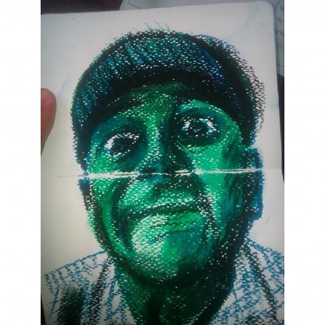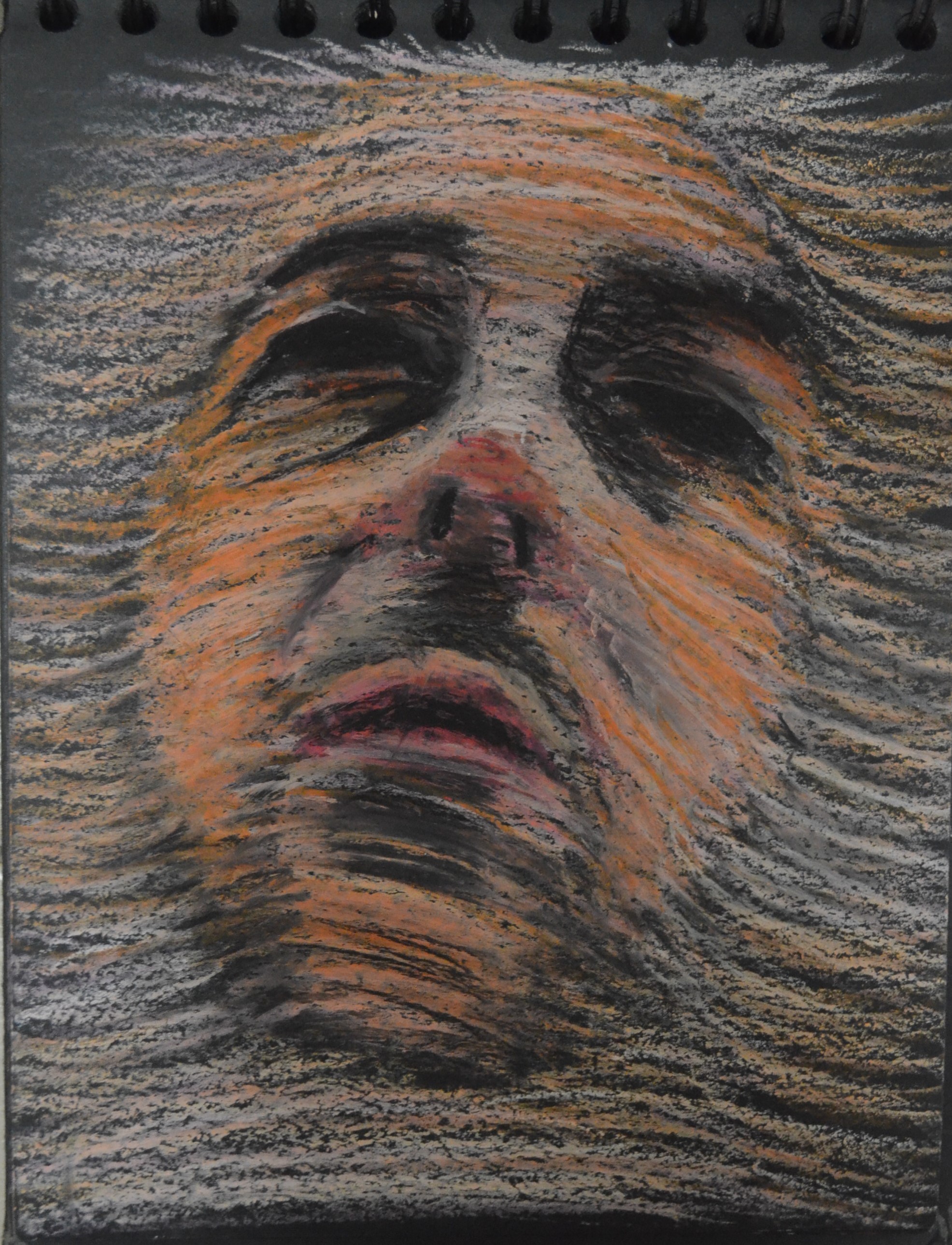 The next sketch was done in oil pastels in my black pad. With this one I kept drawing line over line until it made a shape and then built up the tone the photo here doesn’t do it justice, it looks nothing like me but it does look like it could have been edited from a photo, if that makes sense.