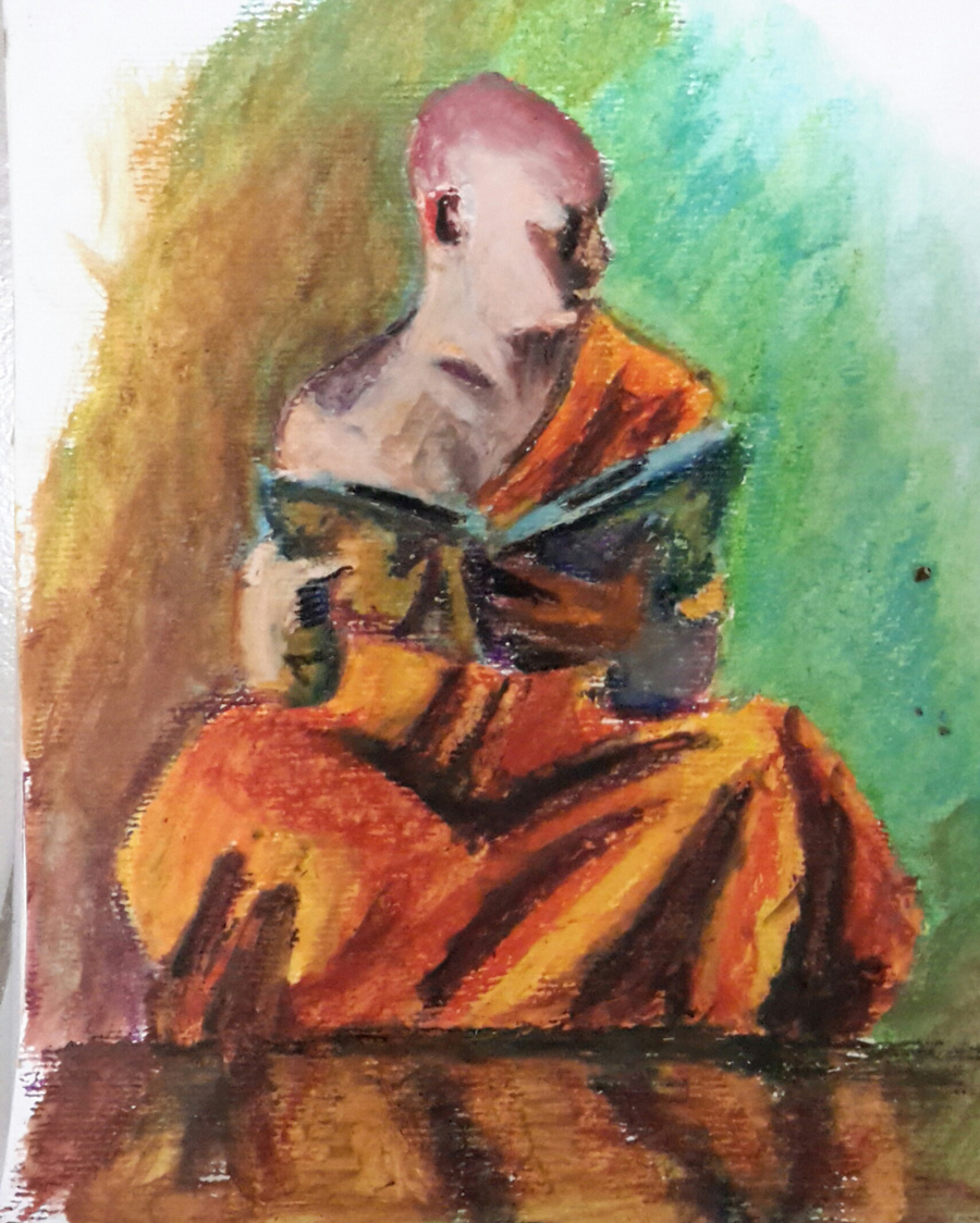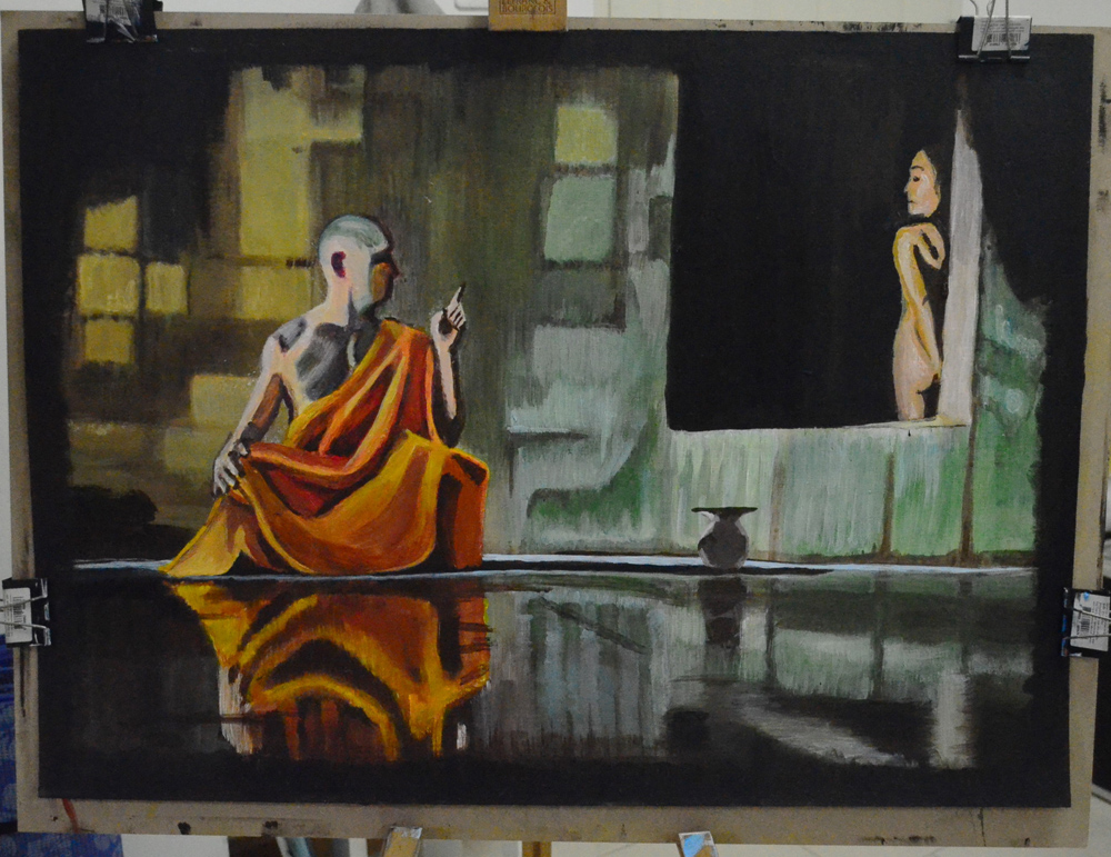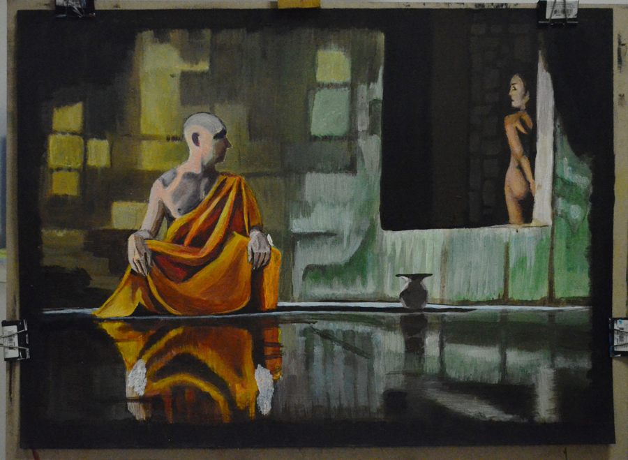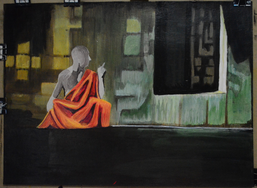 I came across a photograph of a monk reading a book and praying in a temple in Ayutthaya which gave me an idea for this painting and also ideas for how I would go about depicting the stone wall inside the temple. To avoid plagiarism I would adapt the scene to my own painting in myself as the monk and also adding a twist to what was going on. I wasn’t sure of how it would turn out but I was focused on what I wanted the end painting to look like the problem was getting there was to be very time consuming.