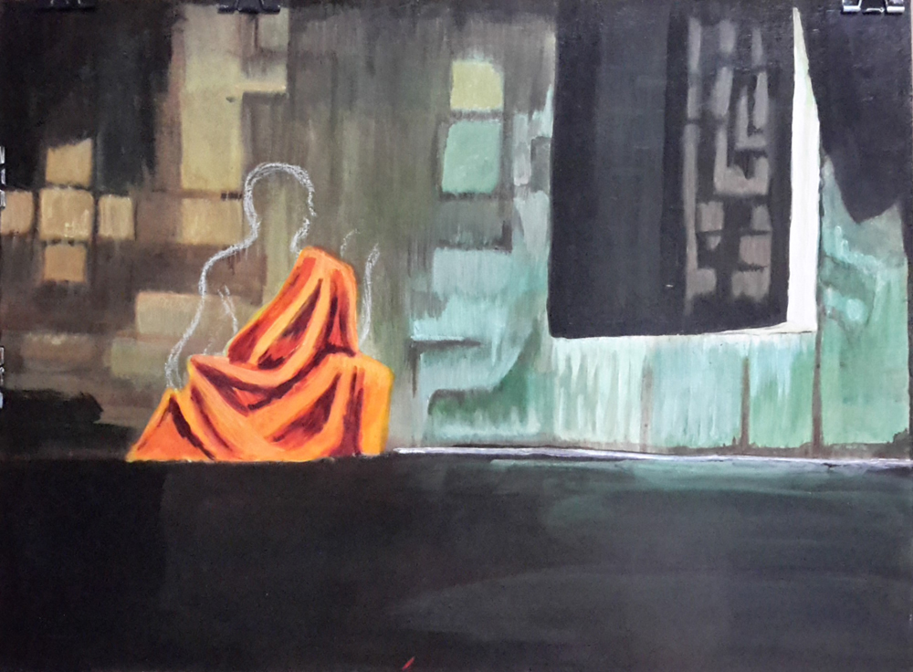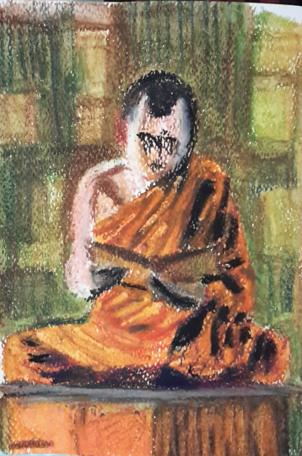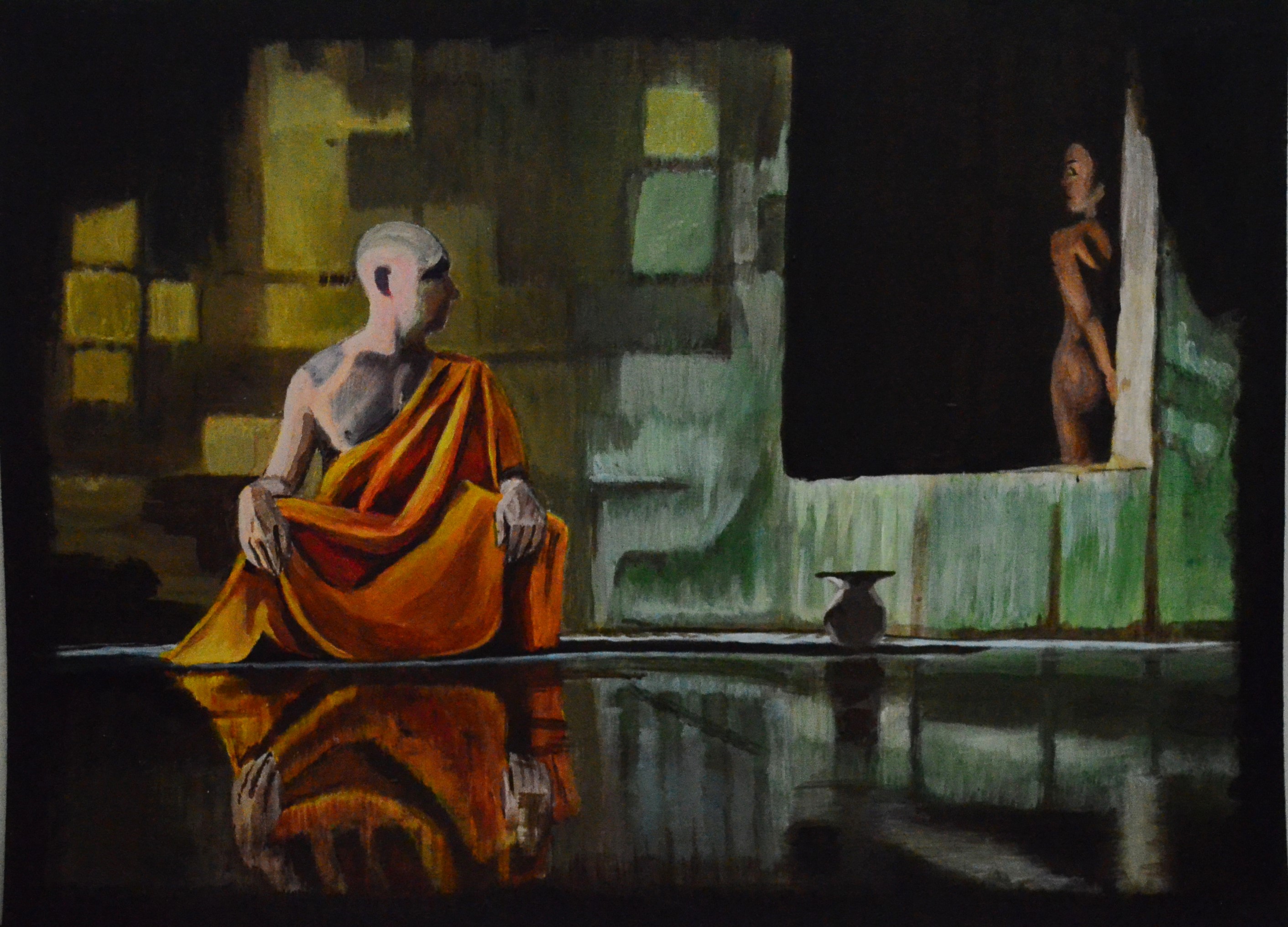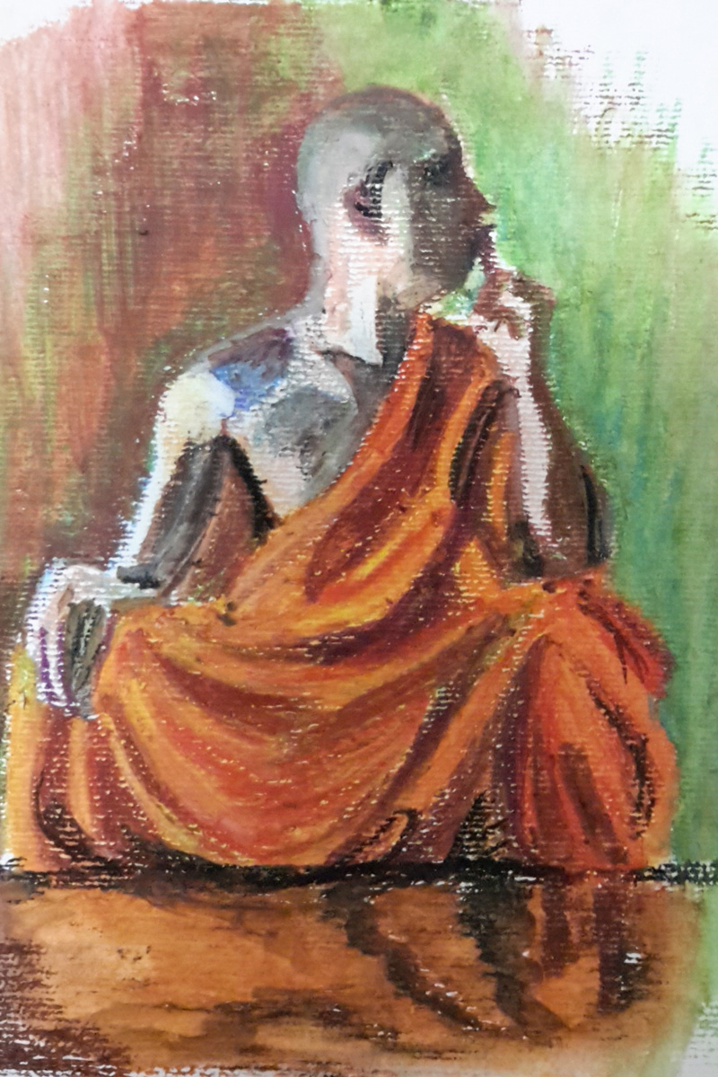I came across a photograph of a monk reading a book and praying in a temple in Ayutthaya which gave me an idea for this painting and also ideas for how I would go about depicting the stone wall inside the temple. To avoid plagiarism I would adapt the scene to my own painting in myself as the monk and also adding a twist to what was going on. I wasn’t sure of how it would turn out but I was focused on what I wanted the end painting to look like the problem was getting there was to be very time consuming.