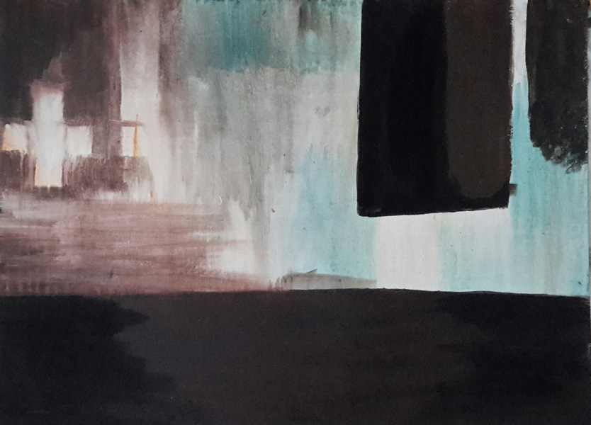 From there I continued to examine the photo to figure out which painting techniques I would use to complete the surroundings. I decided on a dripping technique to start with which would hopefully help me to depict the water stains on the ancient stone walls. As I stated in my previous post I begun this exercise before the ‘A Figure in an Interior’ exercise and so like most of the other exercises I completed it on backing board. I only wish I had painted it on a canvas panel to see how this technique would have turned out on a canvas support.