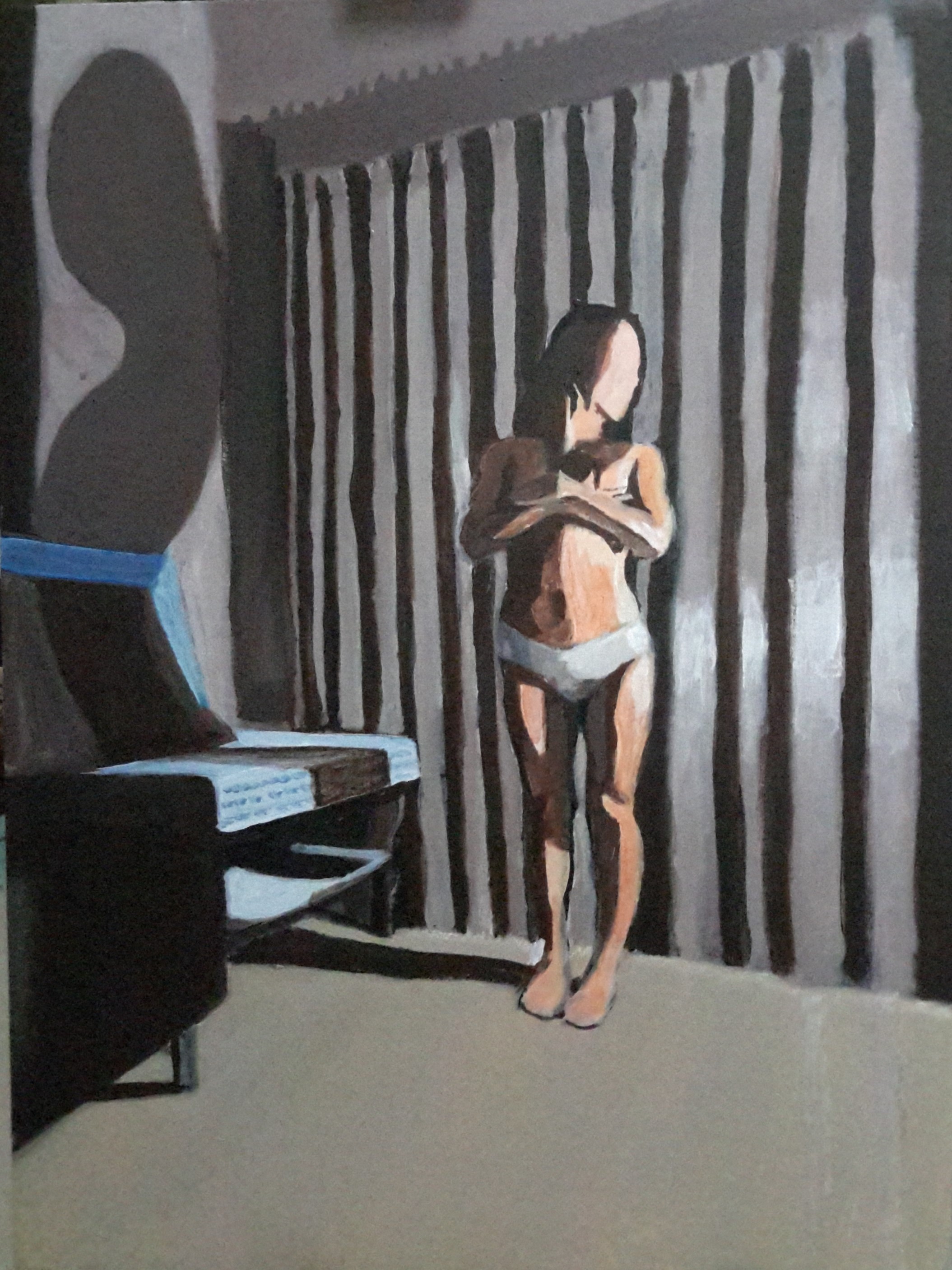 It was late at night and I didn’t want to lose the pose so decided to take a photo and to work from the photo rather from life. The problem was I didn’t want to get back into the habit of producing paintings that were too realistic worrying whether that the painting was as precise as the photograph.