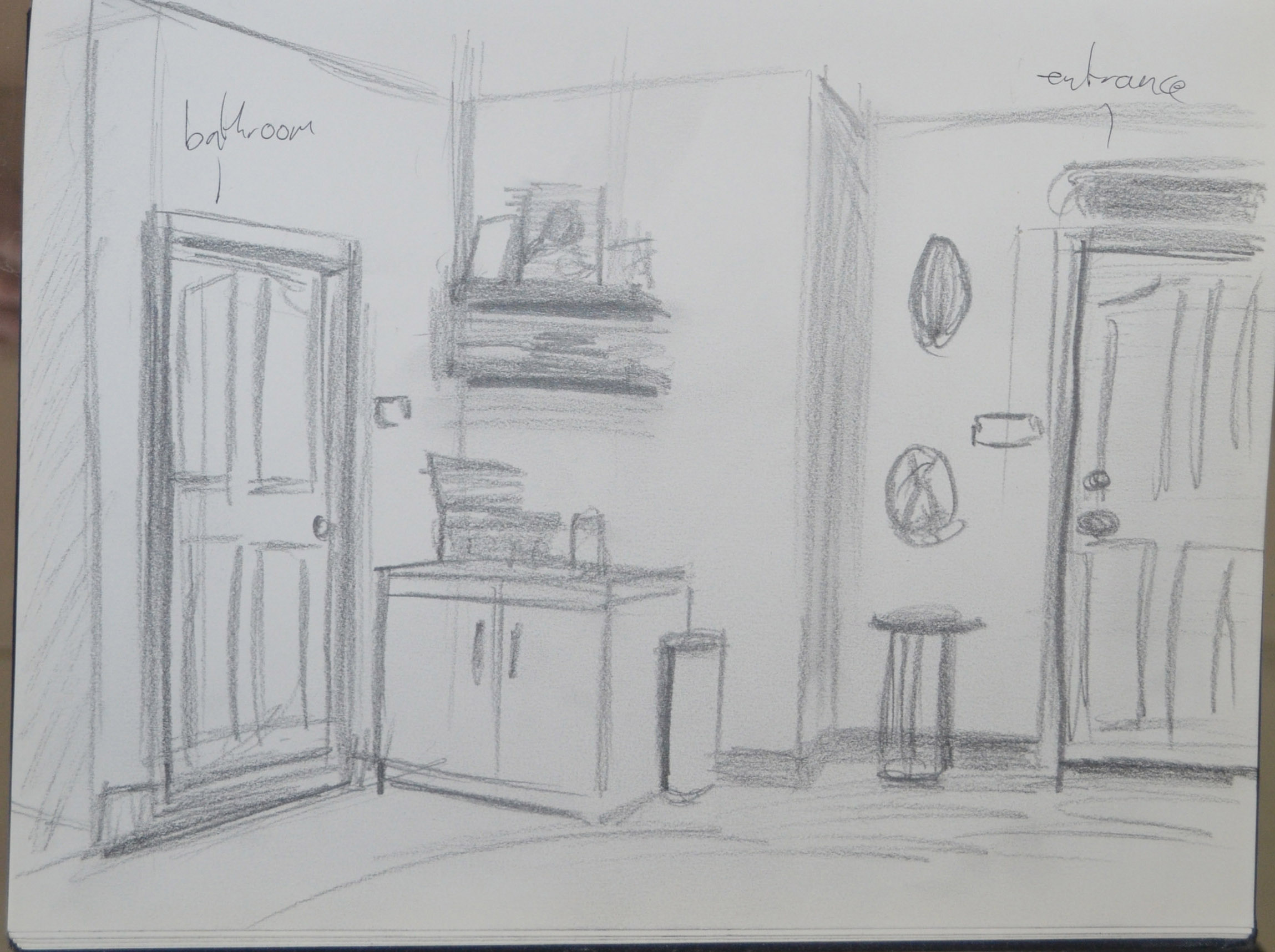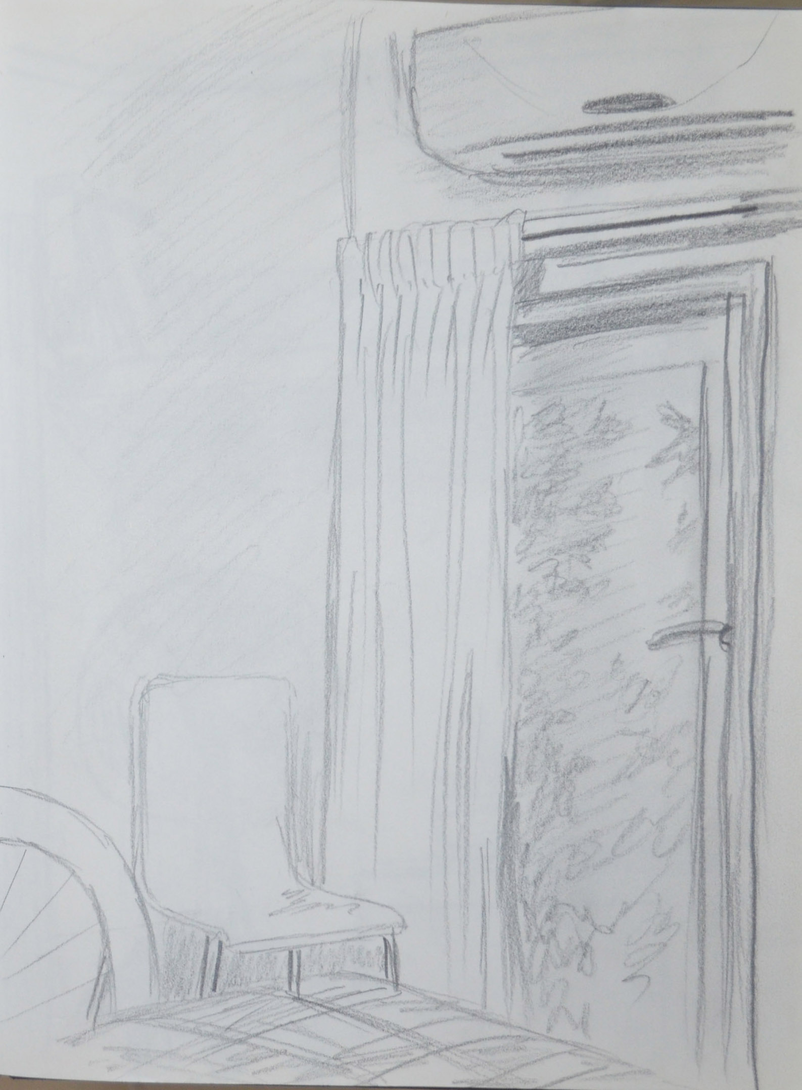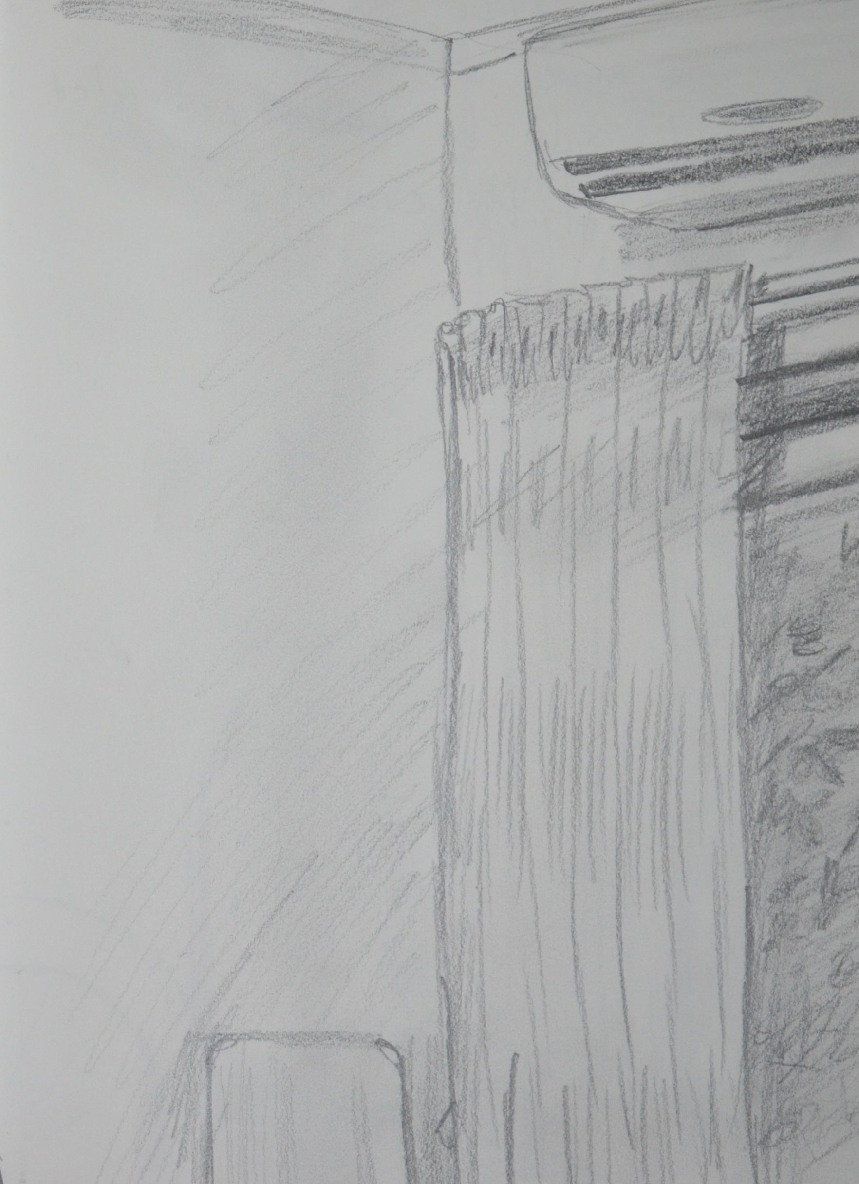 Depicting perspective was always a task in which I had succeeded in my drawing course but not so much when it came to this exercise. I was sat at my table going through the drawings from the last exercise when I noticed there was a part of the living room which I hadn’t drawn and it was probably the best part of the apartment to paint for this exercise. The window to the Juliette balcony flanked by the bedroom and the bathroom door.