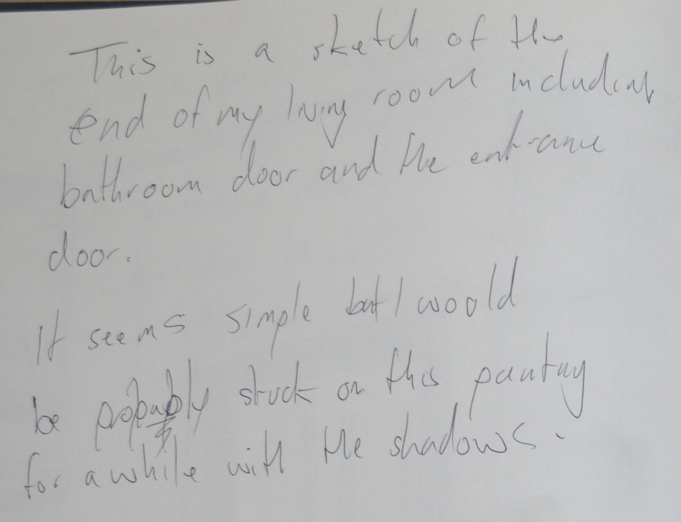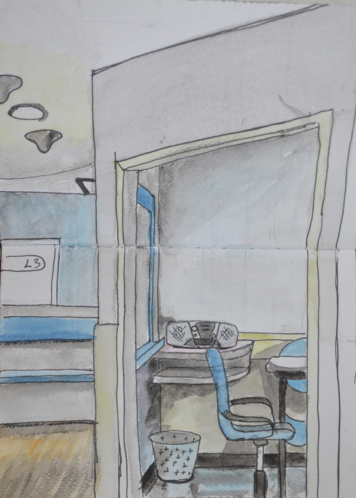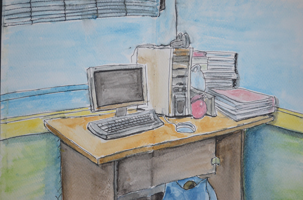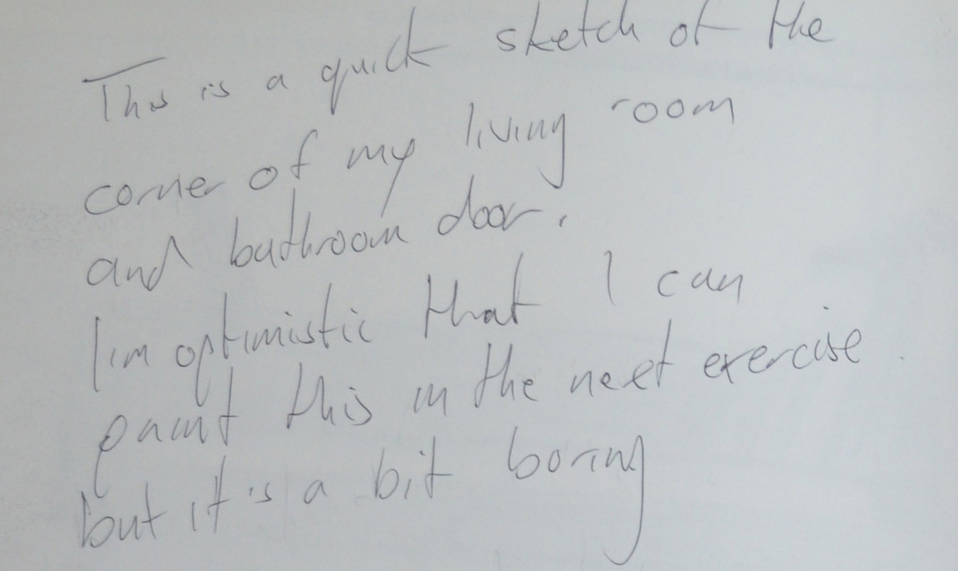 Depicting perspective was always a task in which I had succeeded in my drawing course but not so much when it came to this exercise. I was sat at my table going through the drawings from the last exercise when I noticed there was a part of the living room which I hadn’t drawn and it was probably the best part of the apartment to paint for this exercise. The window to the Juliette balcony flanked by the bedroom and the bathroom door.